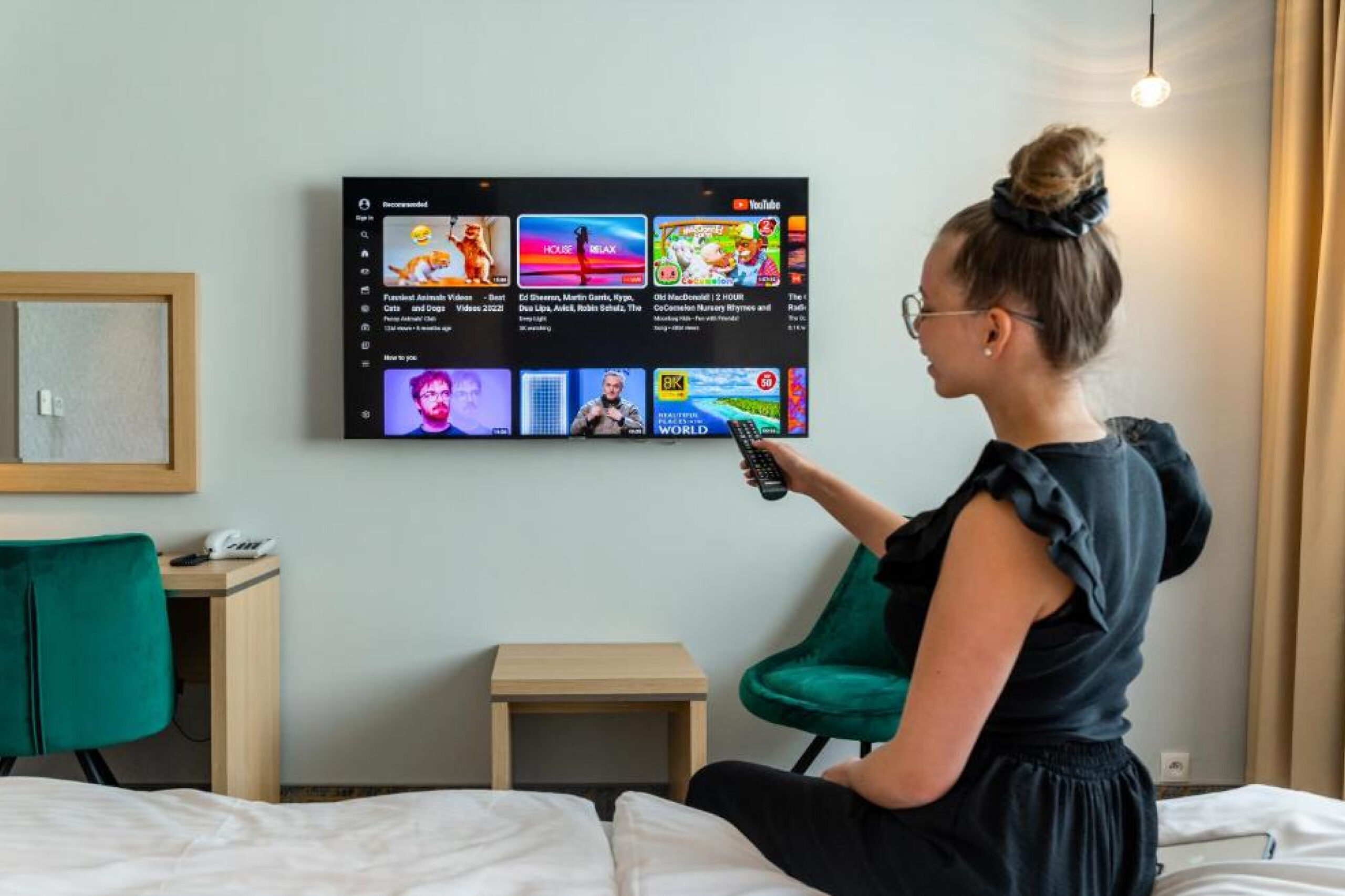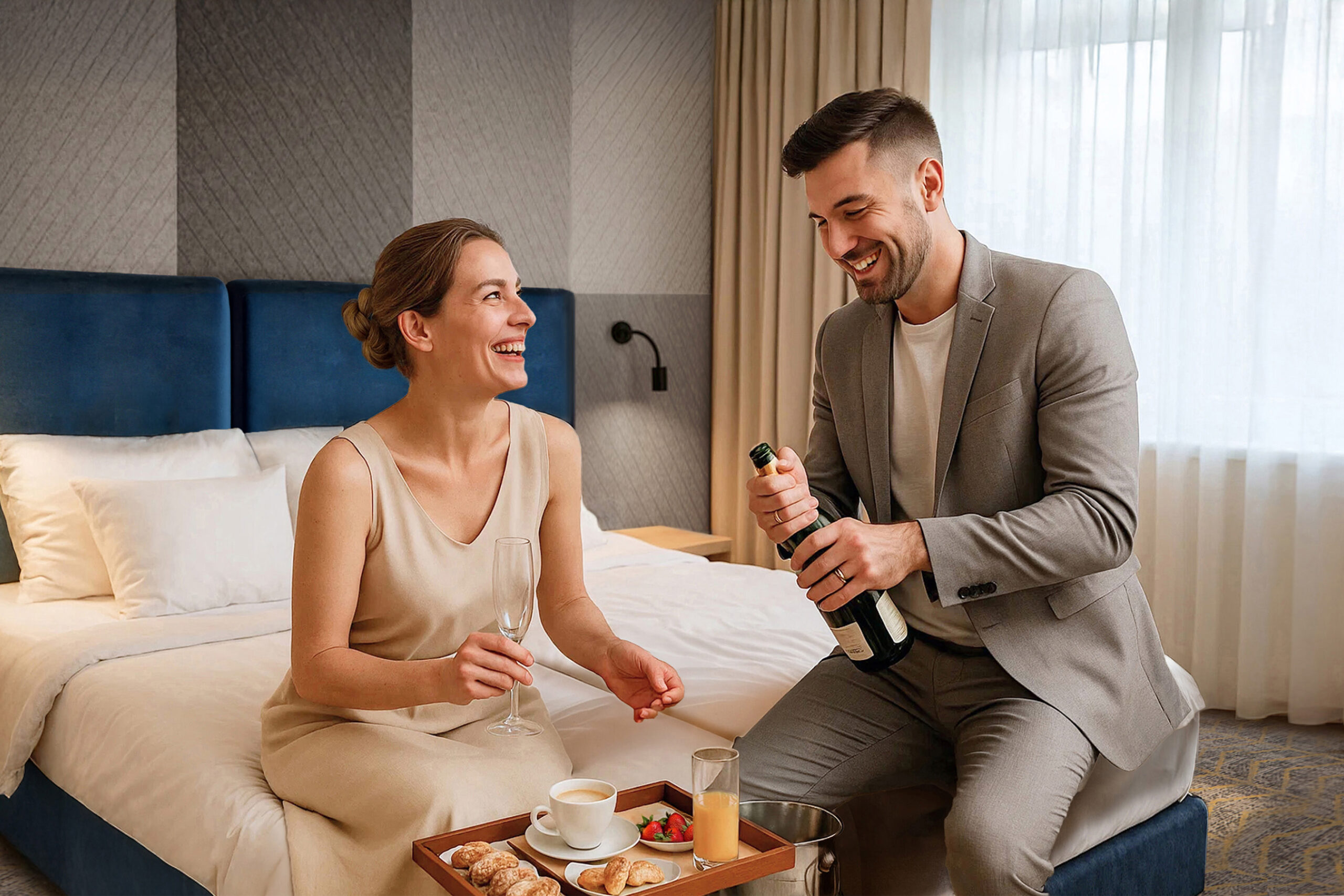 Rozglądasz się wokół i widzisz pojemną szafę. Z łatwością pomieści garnitury na konferencję. “Zmieściłaby też z pół garderobę żony” – dodajesz w myślach. Na wprost znajduje się ogromne łóżko. Aż chce się do niego wskoczyć! Wieczorem rozkładasz się więc wygodnie – ciało od razu znajduje idealną pozycję dzięki materacowi, który łączy w sobie odpowiednią twardość z komfortową miękkością. Jego oddychająca struktura zapewnia optymalną cyrkulację powietrza przez całą noc. Otulasz się miłą w dotyku kołdrą. Na krótką chwilę orientujesz się, że tu absolutnie nic nie słychać. Sekundę później – zasypiasz. Budzisz się wypoczęty, zrelaksowany i do Ciebie należy wybór: jogging wśród okolicznych lasów, szybki trening na siłowni, a może smaczne śniadanie w formie szwedzkiego stołu?